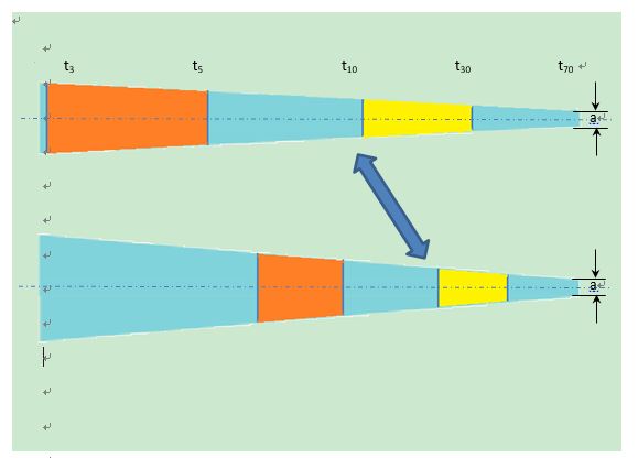 以上兩圖分別表示不同坡度的硫化膠料的試樣縱斷面圖(模具不同),下圖坡度較陡,兩圖薄端厚度相同;上面t3,t5….表示硫化后的試樣的硫化度(Cure Degree);因CD與厚度相關(guān),(同一厚度應(yīng)為相同的CD)。